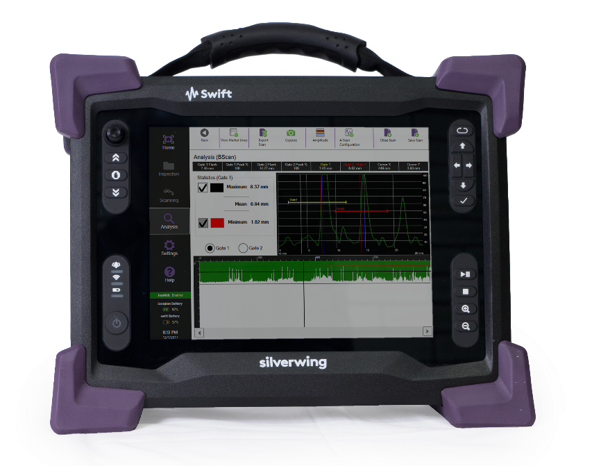 整套系統由超聲主機、手持式B掃描頭和(hé)電纜線組成,可(kě)用于直徑大于50mm的管道(dào)、容器的快(kuài)速腐蝕檢測。人(rén)性化的軟件設計,無需繁雜(zá)的超聲設置,隻需簡單的幾步設置即可(kě)進行(xíng)檢測,實時(shí)顯示A掃描、B掃描和(hé)剩餘厚度值,檢測結果可(kě)以圖形和(hé)Excel方式出具。