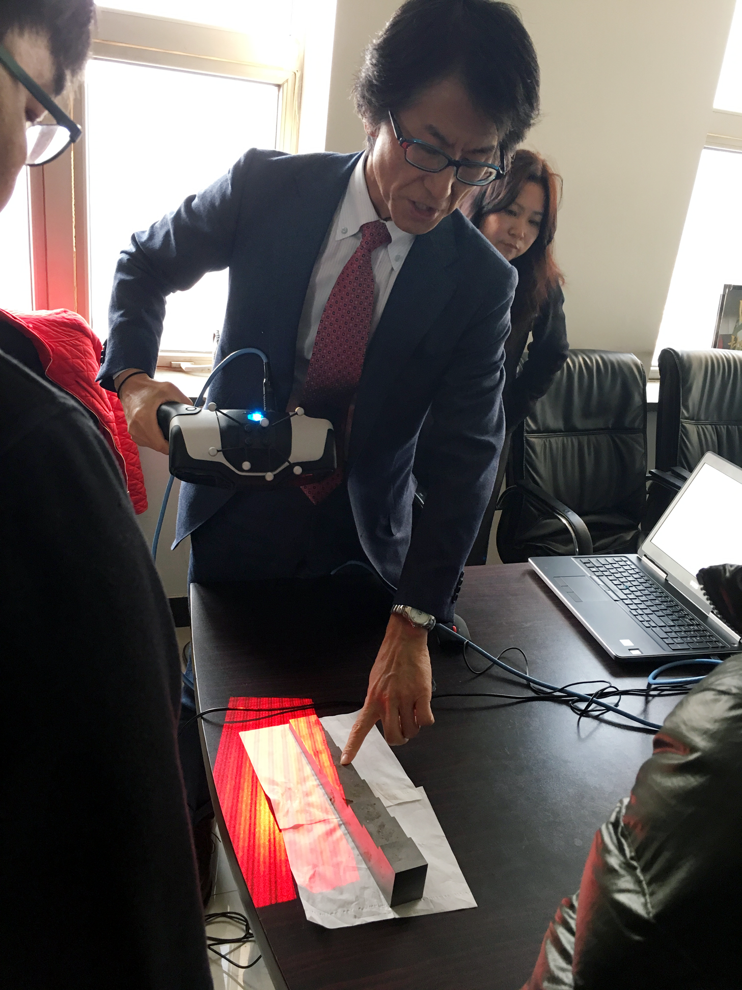 Niimura先生是第二次來訪我公司,此次到訪的主要(yào)目的是進行(xíng)腐蝕缺陷3D成像測量系統有關新産品的宣講和(hé)介紹。該産品是以光(guāng)學技術(shù)為(wèi)基礎并結合現代數(shù)碼電子技術(shù)、非常适合野外(wài)、高空、水下(xià)及危險環境中的表面凹坑三維便攜式測量設備。為(wèi)方便快(kuài)捷,精确測量表面腐蝕坑、撞擊坑、機械損傷等缺陷的3維尺寸,評定提供準确、可(kě)靠的數(shù)據支持。除了(le)介紹新産品之外(wài)Niimura先生另為(wèi)我公司相關産品的舊(jiù)系統進行(xíng)了(le)升級。